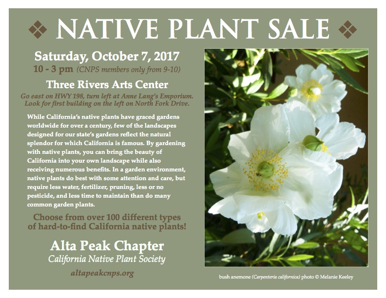 The Alta Peak Chapter will hold its annual native plant sale on October 7, 2017, from 10-3 pm at the Three Rivers Arts Center on North Fork Drive. Chapter members will be admitted at 9 am for an earlybird opportunity to select plants. Also, Chapter members can pre-order plants at a 10% discount. Download pre-order form HERE.